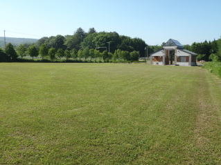 平坦で広々とした芝生サイトです、奥に見える建物はトイレ、流し台です。